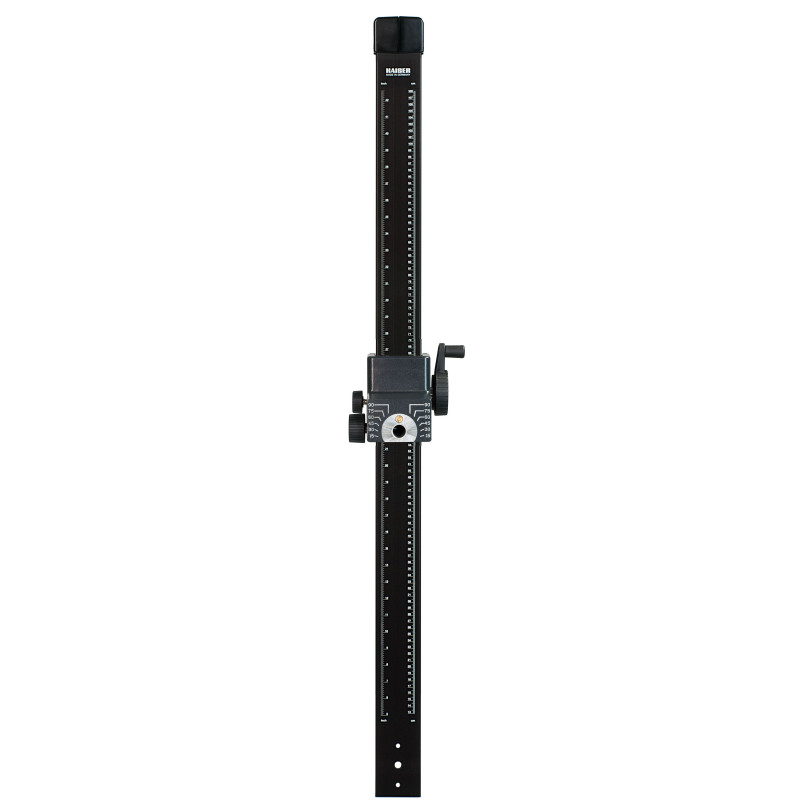Breite und extrem vibrationsresistente Säule aus Aluminiumrohr mit mattschwarz eloxierter Oberfläche und Skalen in cm und Zoll. Höhenverstellbar über Zahnstange, ausgeglichen durch eine integrierte Federwelle, Feststellschraube zur Fixierung der Höheneinstellung. Höhe 1,2 m (47 Zoll).