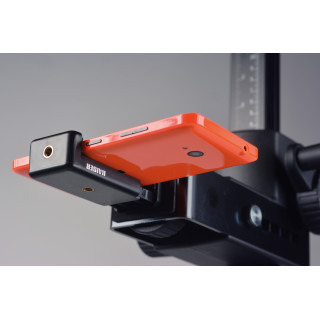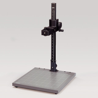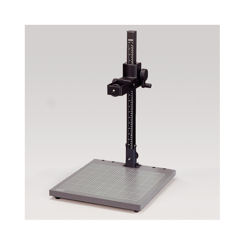 Mattgraue, reflexionsfreie Grundplatte mit fein aufgedrucktem Raster und cm/Zoll-Skala. Säule aus mattschwarz eloxiertem Aluminiumrohr mit cm/Zoll-Skala. Höhenverstellung per Kurbel mit Reibantrieb in Kunststofflagern. Mit horizontal verstellbarem Kameraarm zur Änderung des Säulenabstands, bewegt sich ca. 7 cm (2,7 Zoll) vor- und rückwärts. Befestigungsgewinde 1/4"". Die Säule klappt auf die Grundplatte.