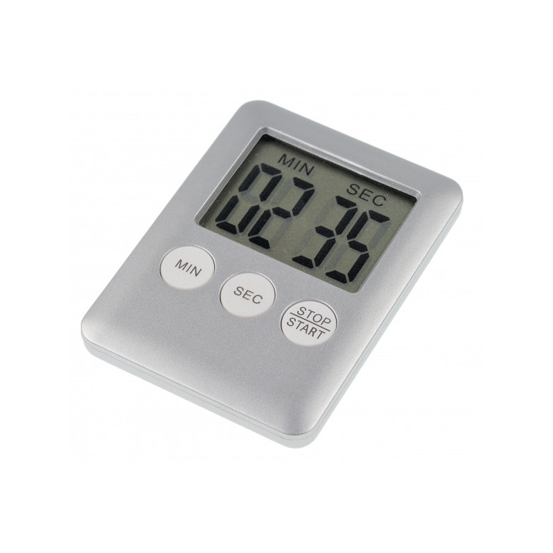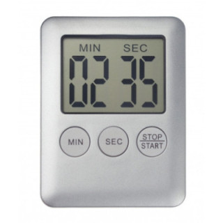 Count-down-Timer und Count-up-Timer (Stoppuhr) mit vierstelliger LCD-Anzeige. Bis maximal 99 Minuten 59 Sekunden, zählt in Einsekundenschritten. Unterbrechung möglich. Akustischer Alarm beim Countdown auf Null. Eingestellte Startzeit abrufbar. Magnet auf der Rückseite zur einfachen Befestigung an Metalloberflächen