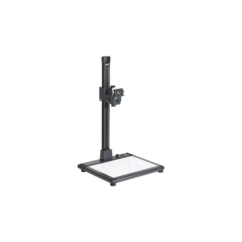 70 mm breite, stabile und schwingungsarme Führungssäule aus mattschwarz eloxiertem Aluminiumprofil mit Skalen in cm und Zoll. Höhenverstellung des Kameraarms über kunststoffgelagerten Reibantrieb mit Kurbel. Gewichtsausgleich durch Drehspiralfeder.
