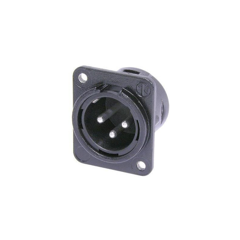 3-poliger männlicher Einbaustecker, Lötfahnen, schwarzes Metallgehäuse, versilberte Kontakte, M3-Befestigungslöcher.