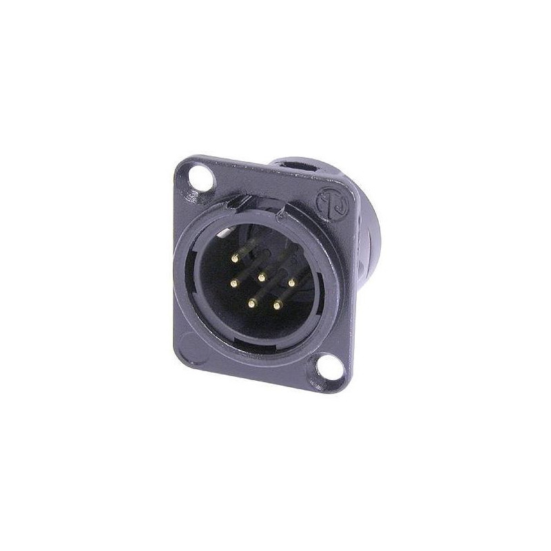 Stecker 6-polig mit Lötfahnen, schwarzes Metallgehäuse, vergoldete Kontakte. Universelle XLR-Einbauserie mit Metallgehäuse in D-Größe. UL-anerkanntes Bauteil. Eigenschaften - Robustes Metallgehäuse vom Typ D - Standardisierter D-Größe Panelausschnitt von 24 mm - Lötfahnen bei den 3- bis 7-poligen Versionen