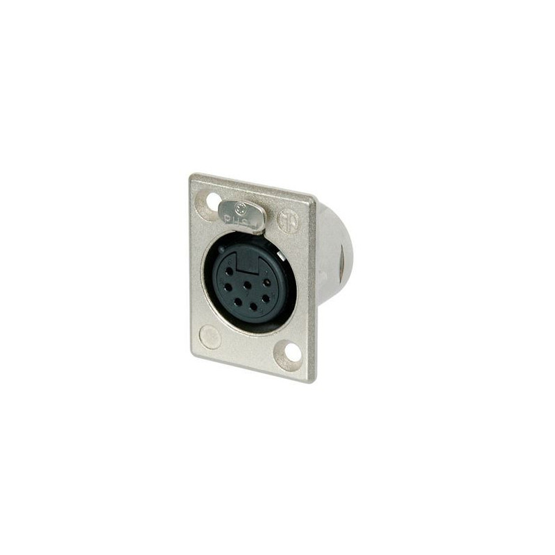 7-polige Einbaubuchse, Lötkontakte, vernickteltes Gehäuse, versilberte Kontakte.