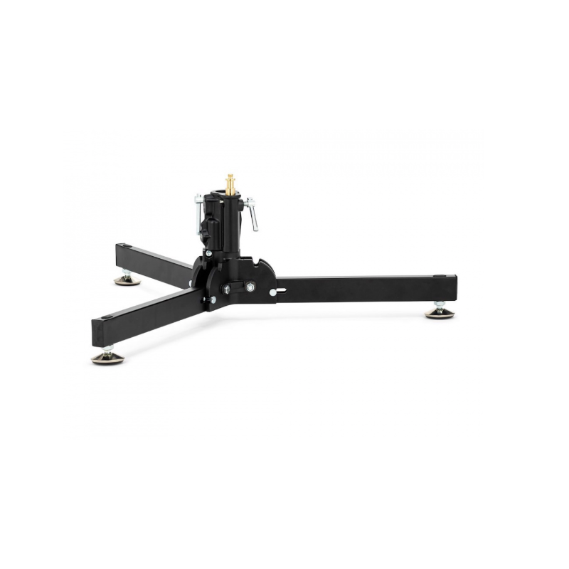 Ein faltbarer Stativfuß ohne Räder. Er verfügt über einen nivellierbaren Beinverlängerer für den Einsatz auf unebenem Gelände. Geeignet für Junior-Zapfen oder Stativverlängerungen mit 1-1/8" Durchmesser. 8,3 Zoll (21 cm) hoch, 29,8 Zoll (0,75 m) Standfläche. Trägt bis zu 88 lbs (40 kg)