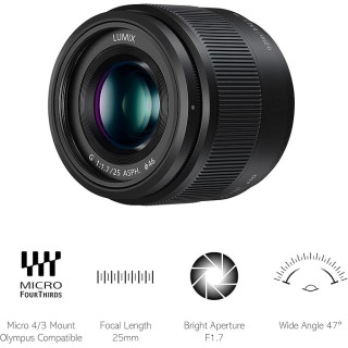 Das Panasonic 25mm f1.7 LUMIX G ASPH Objektiv bietet einen wunderschönen Bokeh-Effekt im Hintergrund für kreative Porträts. Die schnelle f1.7 Blende ermöglicht es, Fotos aus der Hand ohne Blitz in schwach beleuchteten Umgebungen aufzunehmen und die echte Atmosphäre einer Szene mit scharfen und klaren Details einzufangen. Das Objektiv bietet eine Brennweite von 50mm (entspricht 35mm Kamera), die dem menschlichen Auge ähnelt, wenn es auf eine Micro Four Thirds Kamera montiert wird, und nutzt Panasonics 240fps Kontrast-Erkennungs-AF-System. Seine nahe Fokussierentfernung von 0,25m macht es für eine breite Palette von Aufnahmeperspektiven geeignet. Hauptmerkmale: - Schnelle F/1,7 Blende - Erzeugt schönes Bokeh - Ideal für kreative Porträts - 50mm Brennweite (35mm Äquivalent) - Minimale Fokussierentfernung von 0,25m - Micro Four Thirds Anschluss 50mm f/1,7 für eine künstlerische Basis Das schnelle F1,7 Objektiv bietet einen schönen Bokeh-Effekt für beeindruckendere und kreativere Aufnahmen. Kombiniert mit einer 50mm Brennweite (entspricht 35mm Kamera), die fast dem Blickwinkel und der Perspektive des menschlichen Auges entspricht, ist dieses Objektiv ideal für Porträts oder Landschaften, wie wir sie sehen. UHR (Ultra High Refractive Index) Linse Die UHR (Ultra High Refractive Index) Linse und die asphärischen Linsen ermöglichen eine gleichmäßige Darstellung von der Mitte bis zu den Rändern. 240 fps Antriebsfähigkeit Es ist kompatibel mit dem Sensorantrieb bei max. 240 fps*, um das Beste aus schnellen AF-Kameras herauszuholen. Ein internes Fokussiersystem und ein Schrittmotor für sanften und leisen Betrieb arbeiten mit dem hochgeschwindigkeits- und hochpräzisen Kontrast-AF-System der Kamera für Foto- und Videoaufnahmen zusammen.*Die Sensorantriebsleistung variiert je nach Kamera.
