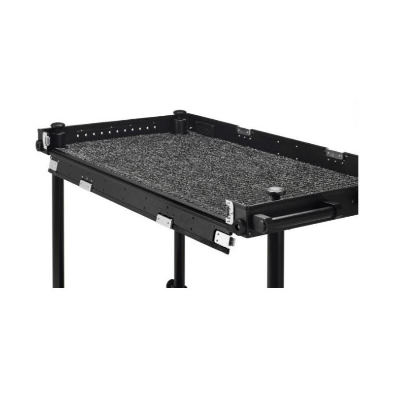 Adicam MAX+ auf 10" Rädern Die Kante der oberen Plattform des Filmwagens kann heruntergeklappt werden. Das Öffnen ist extrem schnell, Sie müssen nur zwei zusätzliche Verriegelungen entriegeln, die sich an der Seite des Regals befinden. Die Lösung garantiert eine Erweiterung des Arbeitsbereichs und noch mehr Komfort bei der Arbeit mit einem Computer oder einer Tastatur.