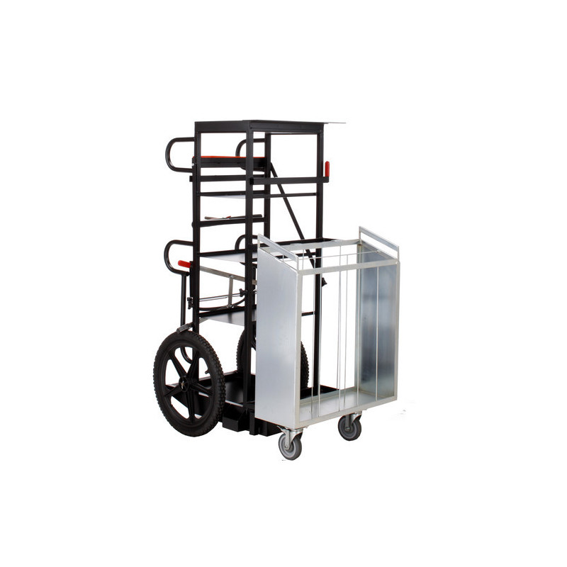 Merkmale: Selbstverriegelungssystem hält Stative und Milchkisten fest, wenn der Wagen abgestellt wird; Fasst (8) C-Stative; Fasst (2) Combo-Stative; Fasst (5) elektrische Baby-Stative; (3) verschiebbare Milchkistenfächer; Hält Sandsäcke; (2) ausziehbare Teleskop-Leiterhalter; Obere Aufbewahrungswanne (fasst (1) Milchkiste) (L15 x B20 x H2)(L381mm x B508mm x H50mm); Unteres Fach (L22 3/4 x B18) (L578mm x B457mm)
