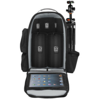Der Rucksack aus Cordura-Nylon verfügt über eine Tablet-Tasche, ein halbstarres Gestell, eine Stativhalterung, zwei XL-Objektivaufnahmen, drei gepolsterte Taschen, mehrere Fächer und einen YKK-Reißverschluss.