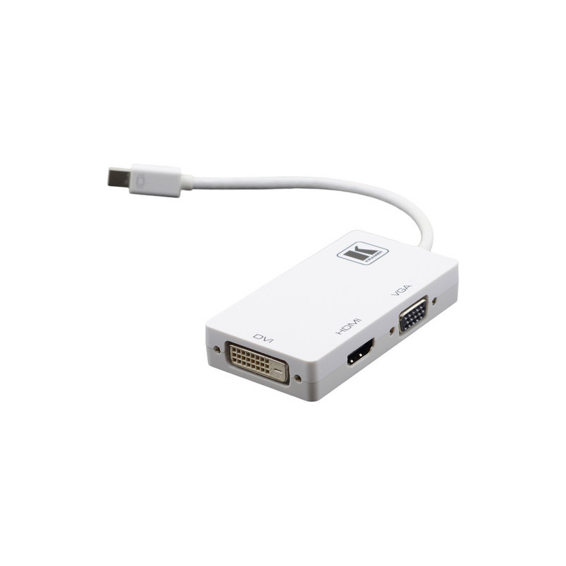 Der Mini DisplayPort zu DVI, HDMI und VGA Adapter von Kramer ist eine All-in-One-Adapterlösung, die ein Mini DisplayPort-Gerät wie ein Apple MacBook mit einem externen DVI-, HDMI- oder VGA-Display oder -Projektor verbindet. Von Computern bis hin zu HD-Fernsehern ermöglicht dieser Adapter das Streamen Ihrer Inhalte in Full-HD-Auflösung von 1920 x 1080 bei 60 Hz. Obwohl dieser Adapter über mehrere Anschlüsse verfügt, kann er jeweils nur ein Format konvertieren und funktioniert nicht für Multi-Display-Konfigurationen.