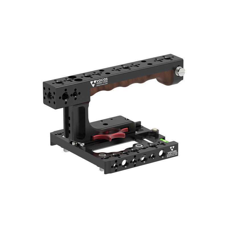Das Kit enthält eine käseartige Deckplatte und einen universellen Schiebe-Tragegriff. Sowohl der obere Griff als auch die Platte verfügen über zahlreiche 1/4"-20 und 3/8"-16 ARRI-Style Anti-Twist-Zubehörgewinde, und der obere Griff wird mit der Vocas-Schiebeschienenbefestigung an der Platte montiert.