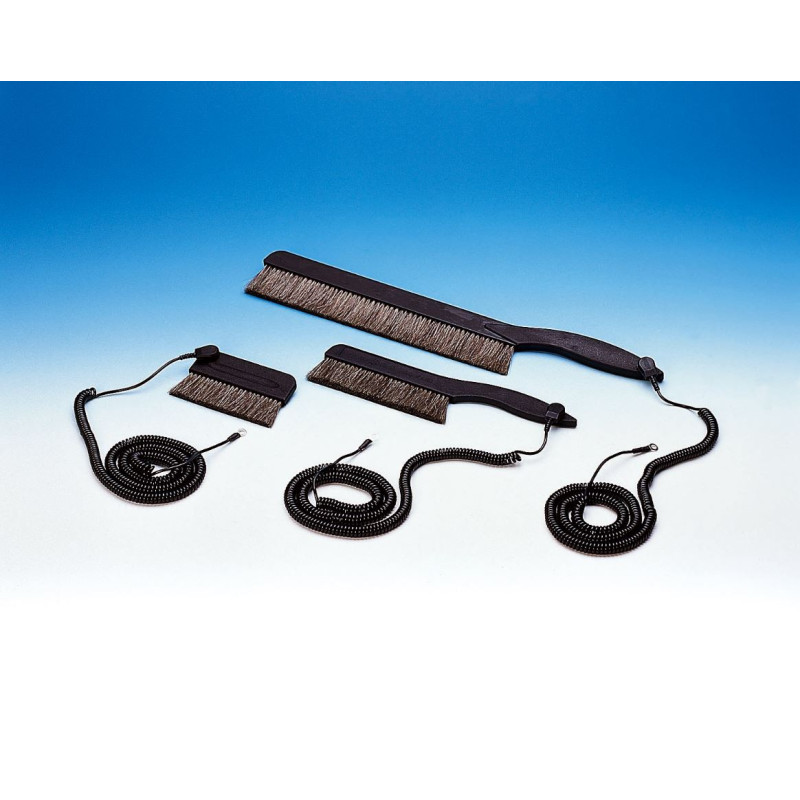 Die Bürste besteht aus einer Mischung sehr flexibler Naturfasern und leitfähiger Synthetikfasern sowie einem leitfähigen Kunststoffgriff.