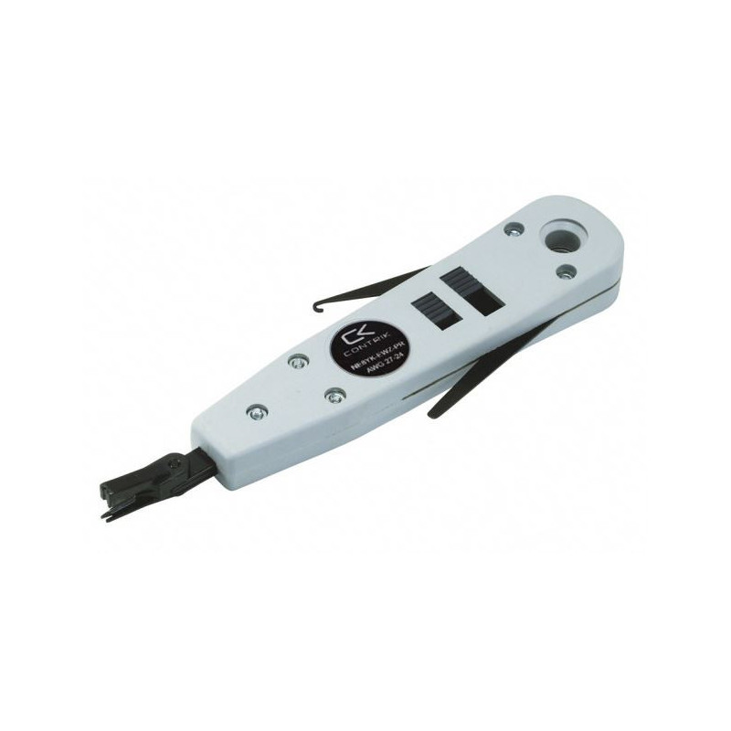 Professionelles Kunststoff-Einpresswerkzeug für die Montage aller NE8FV-YK- etherCON Chassis-Steckverbinder mit Krone-Anschlussklemmen (für Krone IDC-Klemmen) inklusive Drahtschneider und zwei ausklappbaren Hilfswerkzeugen.