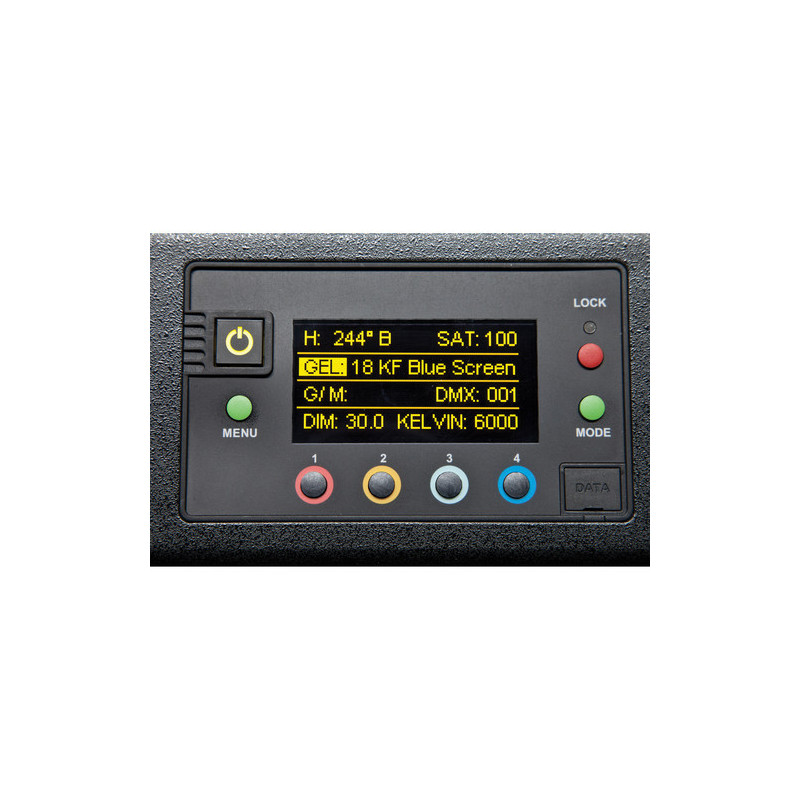 Flexibilität und die zahlreichen Steuerungsoptionen sind entscheidend für die Produktion des Kino Flo Celeb 250 DMX mit Gabelhalterung. Das 72,4 x 42 x 12,7 cm Panel nutzt drei Menüs mit Funktionen, die an der Leuchte, über traditionelles verkabeltes DMX oder über Lumen Radio Funk-DMX gesteuert werden können. Das Weiß-Menü ermöglicht eine Dimmsteuerung von 1 bis 100 %, eine Farbsteuerung von 2700 bis 6500K und eine Grün/Magenta-Steuerung. Es gibt zwei Farb-Menüs. Das erste bietet einen erweiterten Farbbereich von 2500 bis 9900K.