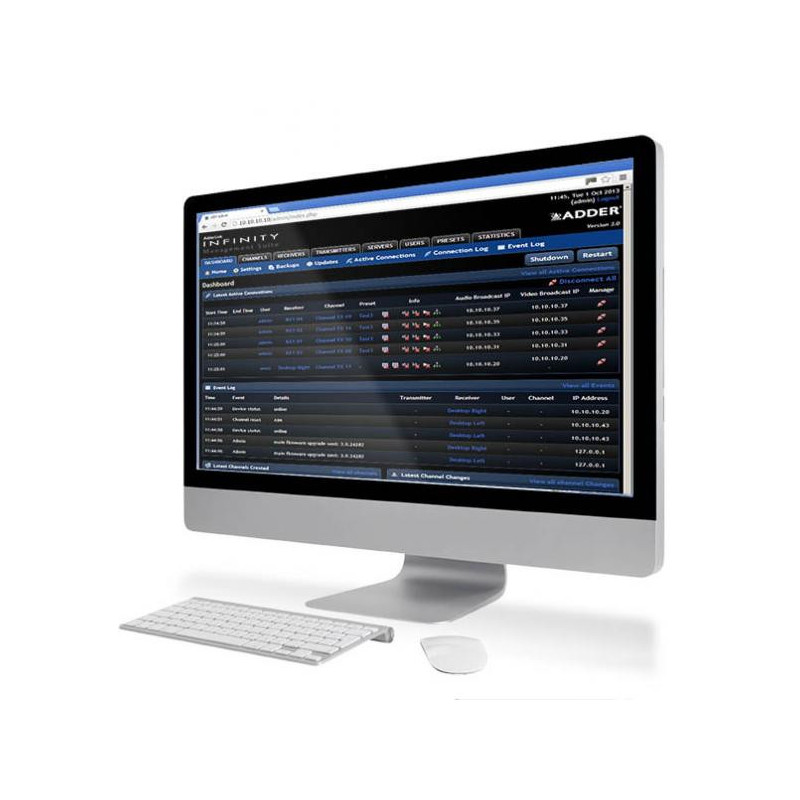 AIM-Softwarelizenzen erfordern den ADDERLink INFINITY Manager A.I.M.-Server. Der A.I.M.-Verwaltungsserver ist eine Steuerungssuite, die AdderLink Infinity-Extender in eine digitale Matrix-Lösung verwandelt. Unter Verwendung einer Standard-IP-Infrastruktur ist es möglich, jeden Benutzerarbeitsplatz zu jedem mit dem Netzwerk verbundenen Computer zu routen, ohne Kompromisse bei der Videoqualität oder Steuerung einzugehen. Es ermöglicht die kooperative Freigabe von Computern und das Video-Multicasting zu jedem Ziel.