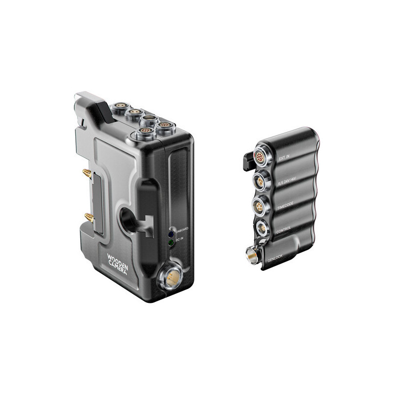 The D-Box and B-Box System from Wooden Camera includes the D-Box with a Gold mount plate and the B-Box external control box.