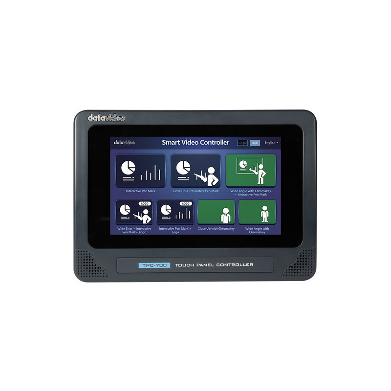Der TPC-700 ist ein multifunktionaler Touchscreen-Controller für Datavideo-Peripheriegeräte. Dieser Controller wird mehrere Firmware-Versionen erhalten, die es ermöglichen, Datavideo-Hardware in verschiedenen Szenarien zu steuern. Die erste Firmware wird die Steuerung des SE-3200 Mischers in einem Unternehmenspräsentationsszenario ermöglichen.