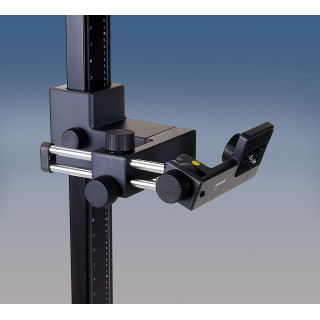 Große mattgraue, reflexionsfreie Grundplatte mit aufgedrucktem Raster, Skala in cm und Zoll. Höhenverstellbare Füße. Wasserwaage im Säulenfuß. Besonders breite und vibrationsdämpfende Säule aus mattschwarz eloxiertem Aluminiumrohr mit Skala in cm und Zoll. Höhenverstellung mit Kurbel und Zahnstange mit zusätzlicher Gewichtskompensation durch integrierte Spiralfeder. Feststellschraube zur Verhinderung versehentlicher Höhenverstellungen. Die Säule kann um 180° gedreht montiert werden.