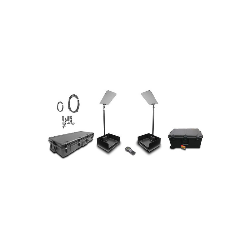 Robotischer Präsidenten-Bühnenprompter Proline Stage Pro Autostep mit automatisch höhenverstellbaren Stativen, zwei professionellen 15-Zoll-Monitoren mit hoher Helligkeit (1000 Nits), einstellbarem Strahlenteilerglas, Autostepper-Kit, Telescroll-Software und robusten Transportkoffern