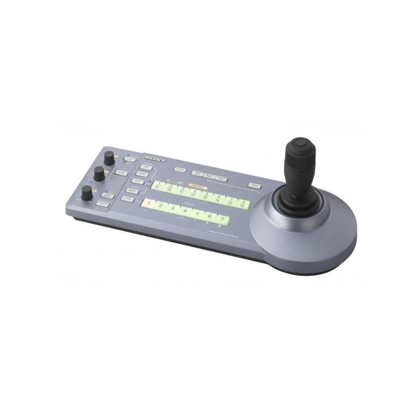 Zu den verfügbaren Steuerungen gehören ein Joystick für Schwenk-/Neige-/Zoom-Operationen, Tasten für Helligkeit/Weißabgleich/Fokus, Tasten für Gruppe/Reset/Gegenlicht/Autofokus/Auto-Weißabgleich und sieben Kameraauswahl-Tasten.
