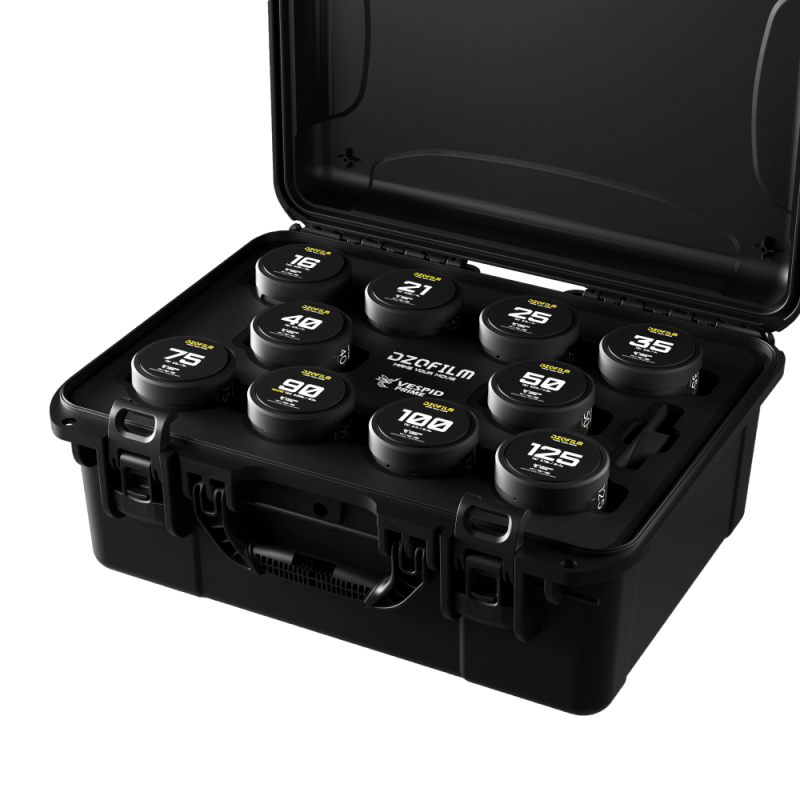 This DZOFilm VESPID Prime Cine 10-Lens Kit is suitable for use on productions ranging from independent to studio films. The included 21, 25, 35, 40, 50, 75, 100, and 125mm T2.1, 16mm T2.8, and Macro 90mm T2.8 PL mount lenses cover full-frame sensors and project a 46.5mm image circle yet are small and lightweight, making them an excellent choice for handheld, gimbal, and drone work.