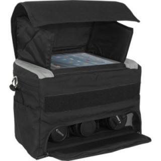 Voll ausgestattet enthält die Tasche zwei konfigurierbare gepolsterte Trenner, um Ihnen zu helfen, das beste Layout für Ihre Ausrüstung zu finden, und eine rutschfeste Klappe an der Vorderseite der Tasche, die zum Halten eines Einbeinstativs verwendet werden kann. Sie verfügt außerdem über einen dedizierten Platz für ein Tablet oben mit einem integrierten Displayschutz und einer faltbaren Blendenabschirmklappe für vereinfachte Nutzung Ihres Tablets im Feld. Hergestellt aus wasserabweisendem 1000D Cordura-Nylon ist diese Tasche entwickelt, um den Elementen zu widerstehen, während sie Ihre Ausrüstung sicher und trocken hält. Ein integrierter oberer Griff ist zum Tragen verfügbar, aber ein mitgelieferter Wildlederschultergurt kann ebenfalls für komfortables Tragen verwendet werden.