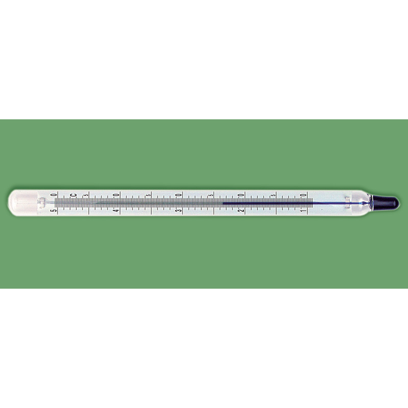 Particulièrement adapté au traitement des couleurs. Bulbe rempli d'alcool. Capillaire lumineux bleu. Échelle de 10 à 50° C, graduée par pas de 0,2 degrés, marge d'erreur ± 0,2°. Profondeur d'immersion max. 60 mm (2,4 pouces). Longueur : 195 mm (7,7 pouces, ø 12 mm (0,5 pouce).