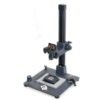 Dispositif de maintien stable pour le positionnement précis des diapositives et négatifs dans différents formats lors de la numérisation avec un appareil photo monté sur un pied de reproduction ou un trépied. Pour utilisation sur des boîtes lumineuses.