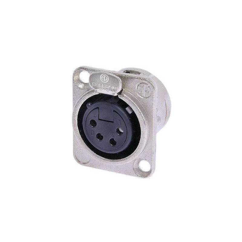 Embase femelle 4 pôles, cosses à souder, boîtier nickelé, contacts argentés.