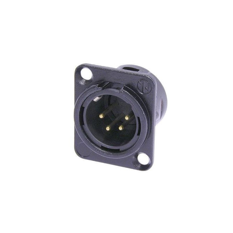 Embase mâle 4 pôles, cosses à souder, boîtier métallique noir, contacts argentés.