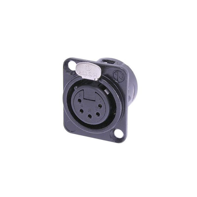 Connecteur femelle 5 pôles, cosses à souder, boîtier métallique noir, contacts argentés. Série XLR universelle de taille D à montage sur panneau avec corps métallique. Composant reconnu UL.