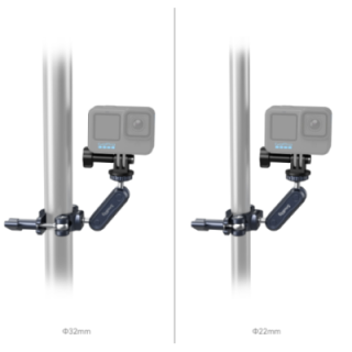 Le SmallRig Handlebar Clamp Mount for Action Cameras 4191 comprend une fixation de guidon et un support de caméra d'action. Fabriqué en alliage d'aluminium de qualité aérospatiale usiné CNC et en acier inoxydable pour une résistance et une durabilité accrues, cet élément hautement compatible prend en charge toute tige de 22 mm à 32 mm de diamètre et offre notamment deux distances de serrage qui conviennent parfaitement aux guidons courants de 22 mm et 31,8 mm de diamètre en ajustant simplement l'engrenage, augmentant ainsi la surface de contact, sécurisant et protégeant votre caméra pendant le cyclisme. Il dispose également de patins en caoutchouc de protection pour éviter les rayures et augmenter la stabilité du serrage. Le bras magique à rotule, qui se compose de deux rotules et d'une pince à rotule, est relié à la fixation du guidon par une vis mécanique anti-torsion et anti-détachement. Ses rotules réglables à 360 degrés présentent des textures annulaires pour les verrouiller et empêcher tout mouvement. Il y a un trou hexagonal en bas pour un serrage renforcé avec une clé Allen et une vis 1/4"-20 en haut pour permettre le montage de GoPro, insta360 X3, DJI Action3, AKASO, etc.