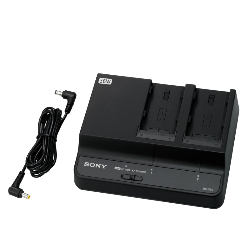 The dual battery Sony BC-U2A desktop-style charger was designed for Sony's BPU30/60 Series lithium-ion battery packs. Simultaneously charge 2x BPU30 or BPU60 batteries. You can also pair this charger with your PMW-EX1 camcorder as an AC power adapter and simultaneously charge a single battery.
