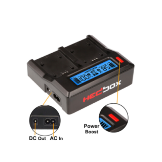 The Hedbox RP-DC50 Digital LCD Dual Battery Charger Kit with RP-DJC70 Battery Plates is a two-bay solution that safely charges your batteries while providing a 2.1A, 5 VDC USB output. Two JVC SSL-JVC50-compatible battery plates are included in this kit.
