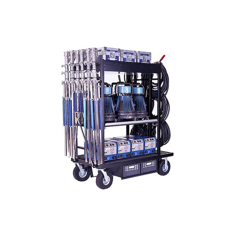 Le chariot HMI de Backstage Equipment est un chariot de manutention d'équipement pour l'industrie du cinéma et de la télévision. Il est fabriqué en acier avec une finition noire martelée et a une charge utile de 453 kg.