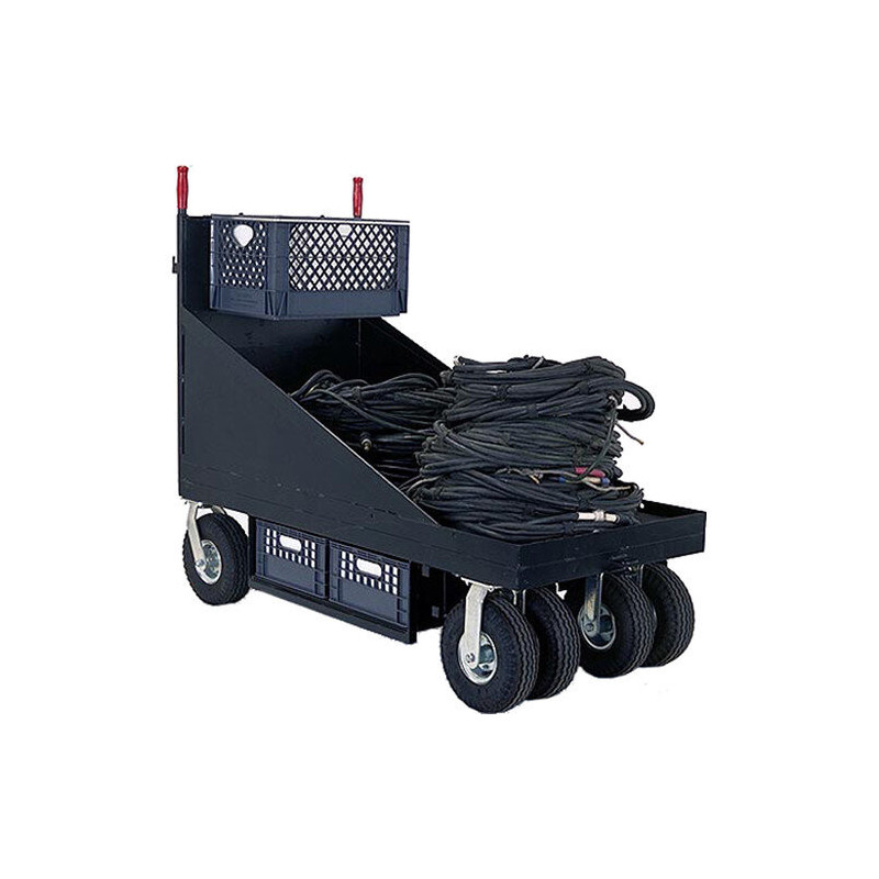 Caractéristiques : Maintient le câble en forme de 8 ou enroulé ; Double crochets pour maintenir (1) caisse à lait de taille standard ; (1) Étagère fixe (L54 x l26) (L137,2cm x l66cm) ; Boîte à manettes pour (2) demi-caisses à lait ; Roues (2) roulettes pivotantes de 10 pouces et (4) roulettes fixes de 10 pouces ; Frein à pied ; Barre de traction