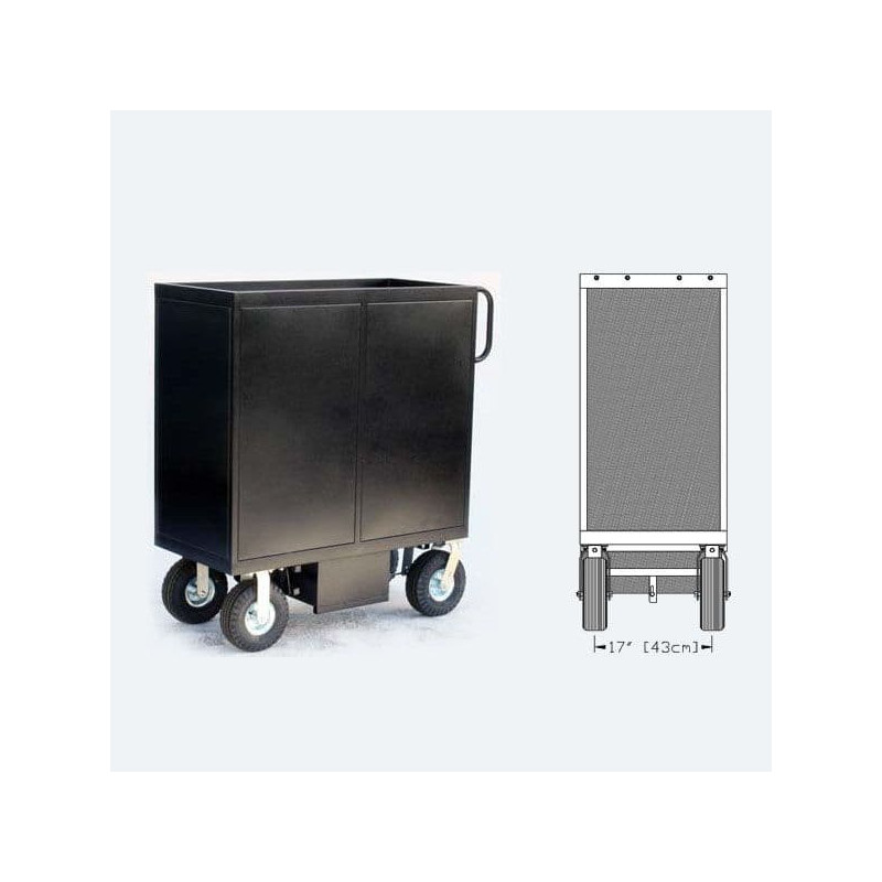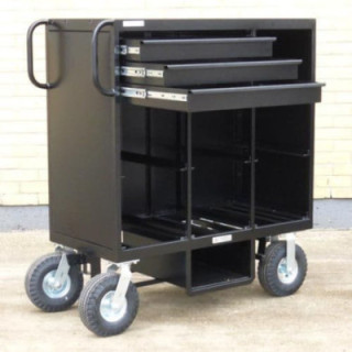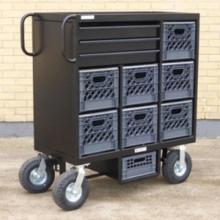 Le chariot Mini Cart Set Box 7 caisses de Backstage Equipment est un chariot de transport d'équipement pour l'industrie du cinéma et de la télévision. Il est fabriqué en acier avec une finition noire martelée et a une charge utile de 453 kg. Il peut contenir jusqu'à sept caisses à lait avec sept compartiments coulissants pour caisses à lait. Il est équipé de trois tiroirs à extension complète avec des glissières à ouverture par pression.