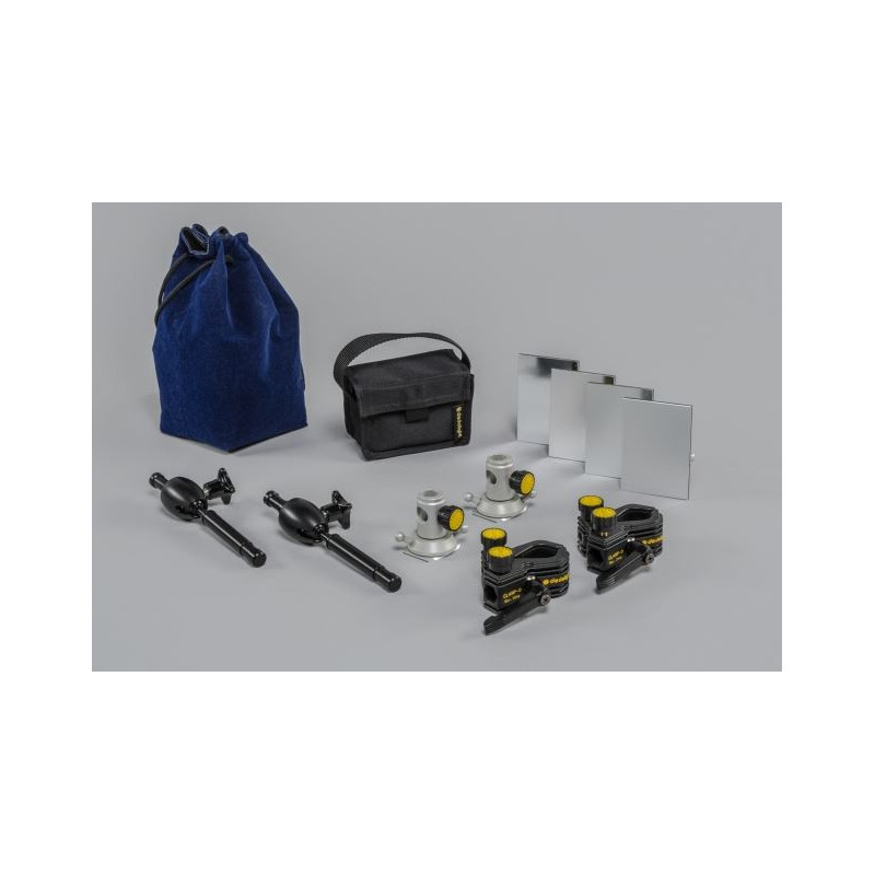 Kit de sac souple avec 4 réflecteurs de 7x10 cm. Le kit comprend : réflecteur 1, 2, 3, 4, un de chaque. Deux dispositifs de verrouillage et deux bras pivotants.