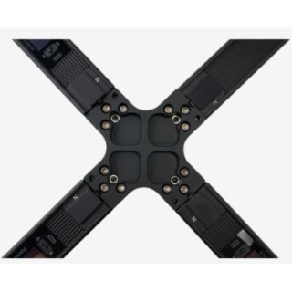 The passive INFINIBAR 4-Way Flat Connector from Aputure is a metal splicing connector for arranging four INFINIBARs at 90° offsets. The connector features 1/4"-20 threads for mounting the included eyebolts, along with cutouts allowing access to the power inputs.