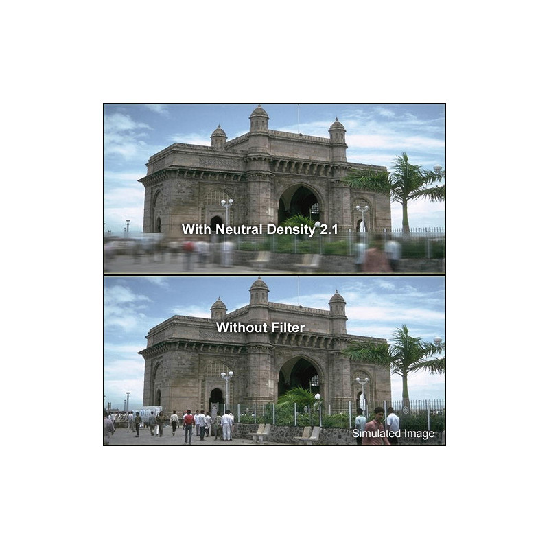 - Le filtre ND uniforme 2.1 assombrit l'image, permettant une photographie avec une vitesse d'obturation plus lente ou une ouverture plus large que normalement nécessaire.