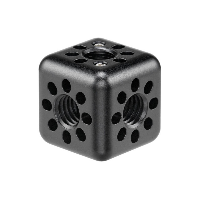 Le cube de 1 pouce comporte une vis mâle 1/4"-20 avec des goupilles anti-rotation sur un côté pour le montage sur une cage ou un support, et ses cinq autres côtés comportent des filetages femelles 1/4"-20 avec des encoches anti-rotation.