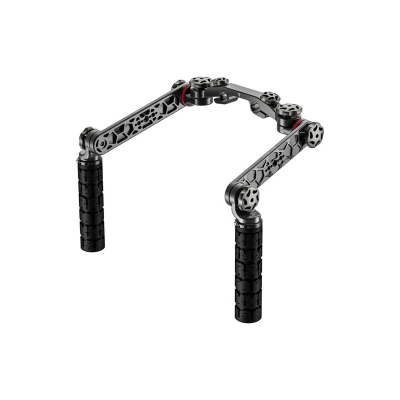 Le kit de poignées est conçu pour la robustesse, le confort et la rapidité sur le plateau. Ce kit comprend une barre transversale de 15 mm, deux extensions de 6 pouces, une paire de poignées de style BMX ODI, des boutons en acier inoxydable avec revêtement DLC, et huit anneaux de couleur pour personnaliser l'identification de la caméra.
