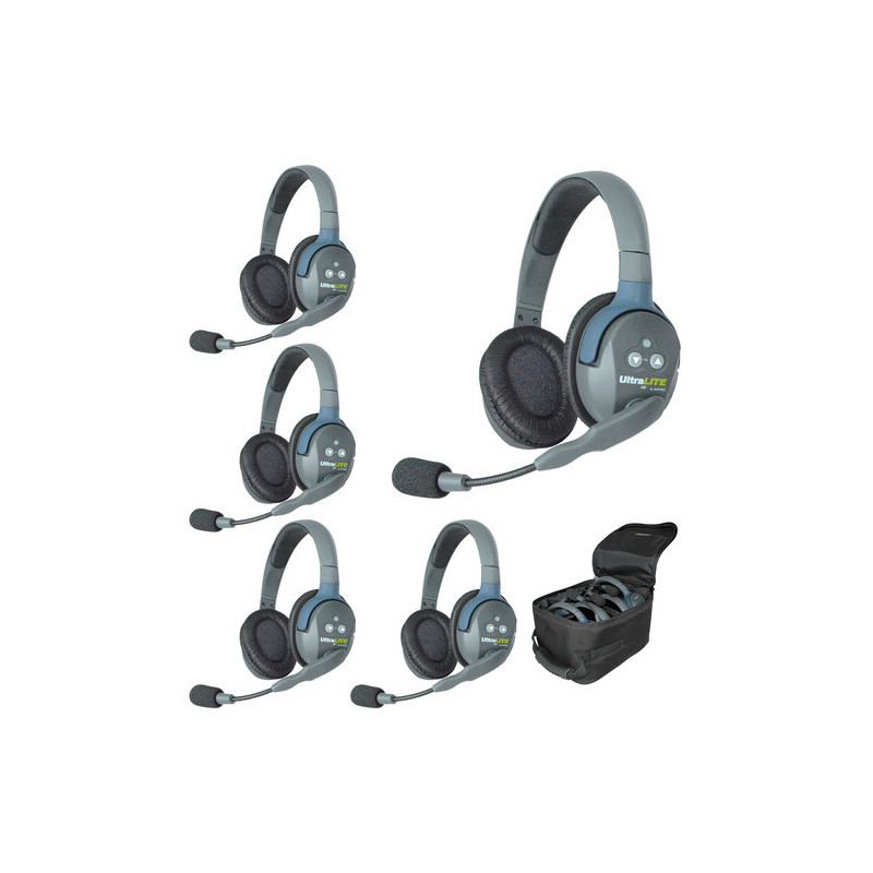 L'Eartec UL5D est un intercom professionnel full duplex pour cinq personnes qui ont besoin de communiquer et de travailler avec leurs mains. Ce système compact comprend cinq casques doubles sans fil UltraLITE, un "Master" qui définit la séquence numérique et quatre casques "Remote". UltraLITE utilise la technologie DECT (Digital Enhanced Cordless Technology) pour fournir une communication sans fil professionnelle avec conversation simultanée dans un rayon d'un quart de mile.