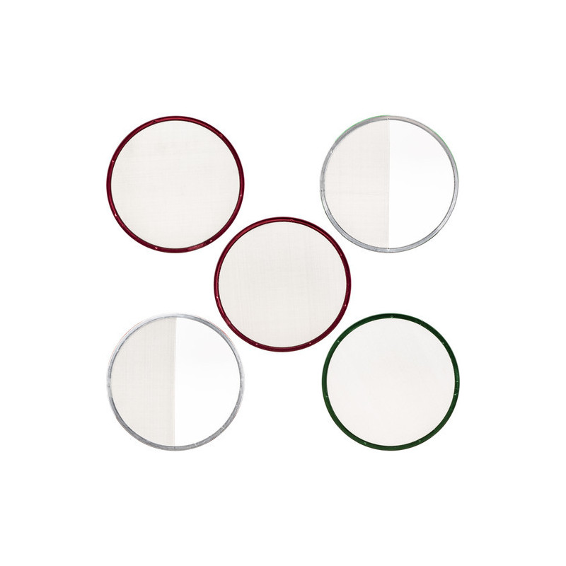 Cet ensemble de scrims en acier inoxydable Matthews 16,8 cm (6-5/8") comprend un simple plein, deux doubles pleins, un demi simple et un demi double. Ils sont résistants à la rouille et supportent mieux la chaleur intense et irrégulière, ce qui les rend préférables pour une utilisation avec des luminaires à face ouverte non Fresnel. Les scrims sont conçus pour réduire l'intensité lumineuse à la source sans affecter la température de couleur, et les demi-scrims réduisent une partie du faisceau et sont utilisés lorsque la lumière frappe le sujet ou le plan d'arrière-plan à un angle. Ils peuvent être empilés pour obtenir une variation illimitée de l'intensité lumineuse.