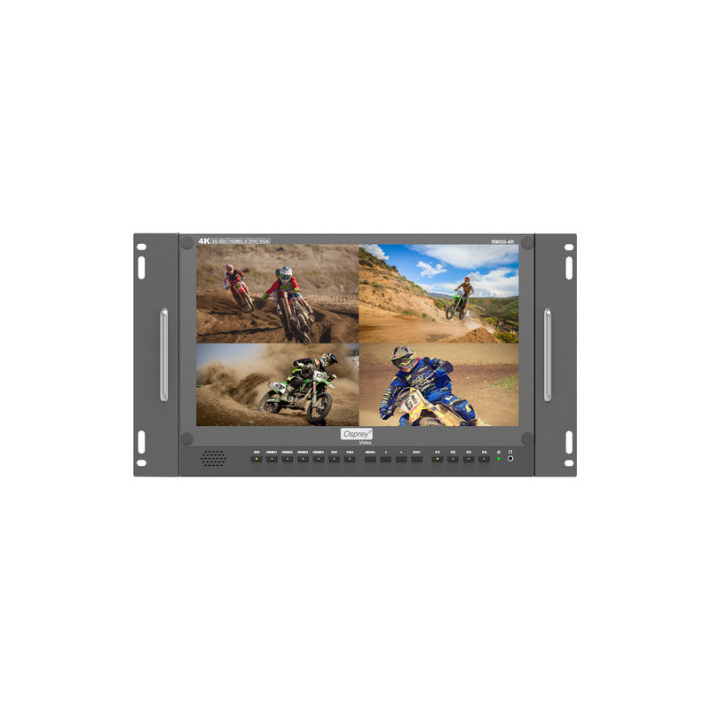 Le RM3G-4K est un moniteur 4K offrant une véritable résolution native de 3840x2160. Il sert de moniteur de terrain monté dans un flight case robuste ou, lorsqu'il est retiré, de moniteur rack 19". Il prend en charge les entrées vidéo 3G SDI, HDMI2.0, DVI ainsi que VGA. Les quatre entrées HDMI comprennent une entrée HDMI2.0 compatible 4K60 plus trois entrées HDMI1.4 compatibles 4K30. En tant que fonctionnalité supplémentaire, il prend également en charge l'entrée audio non balancée.
