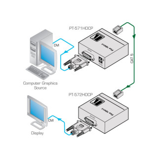 Le PT-571HDCP est un émetteur à paire torsadée DGKat™ pour signaux DVI. Le PT-571HDCP convertit le DVI en signal à paire torsadée et le PT-572HDCP+ reconvertit le signal à paire torsadée en DVI. Le PT-571HDCP-MD est certifié pour les applications médicales.