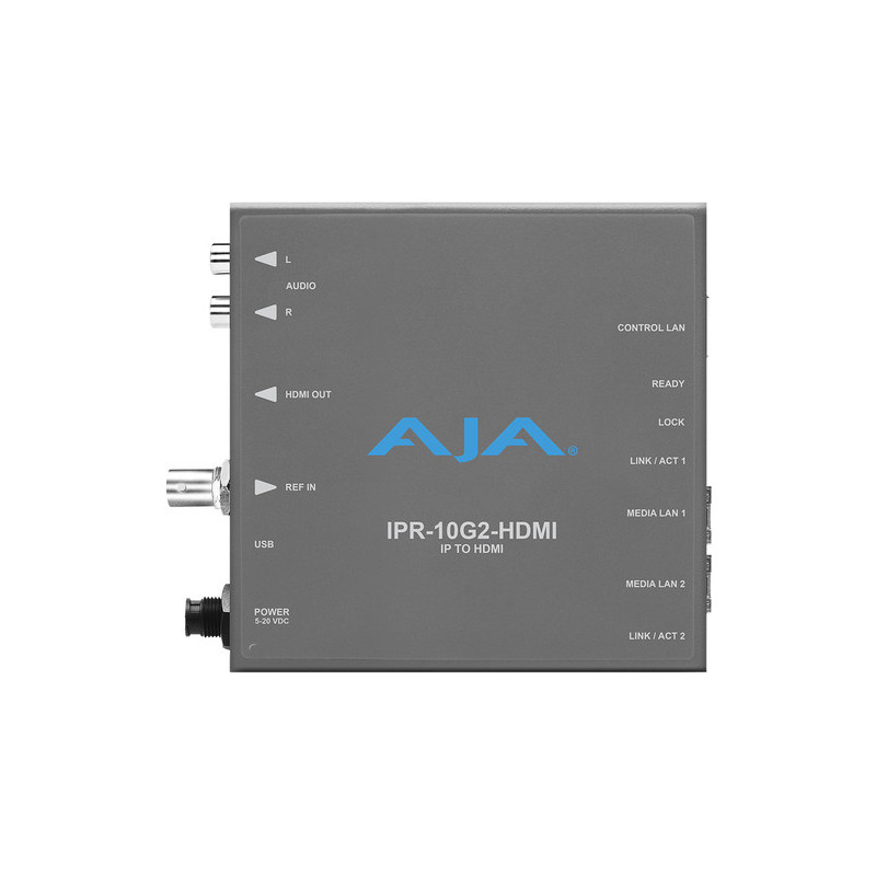 Décodant un signal IP SMPTE ST 2110 HD, le Mini-Convertisseur IP SMPTE ST 2110 vers HDMI d'AJA vous permet de surveiller et de sortir de la vidéo SMPTE ST 2110 (RTP) et de l'audio (AES67) sur une connectivité réseau 10 GigE.