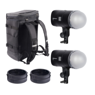 Le kit double flash déporté ONE impressionnant d'Elinchrom comprend deux têtes de flash déporté ONE, deux adaptateurs OCF, deux dômes de diffusion OCF, deux chargeurs muraux USB Type-C de 65W, deux câbles USB-C de 5.9', et un sac à dos Elinchrom ONE pour 2 flashs.