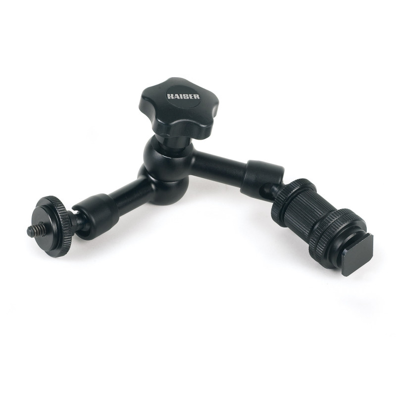 To mount and individually align cameras, lights and accessories. With ball-and-socket joints at both ends. Both ball-and-socket joints and the middle joint are released and tightened by a central locking disk. Sturdy metal design. 1/4" camera connection thread. Mounting via slide-in foot, 1/4" male and female thread is possible with adapters included. Max. load 2 kg (4.4 lbs.), in horizontal position 1 kg (2.2 lbs.).