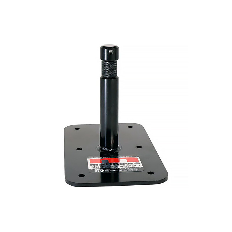 Cette plaque bébé Matthews avec une broche de 3" est une plaque de montage en acier avec une finition noire hyper-chrome. La broche de 3" a un diamètre standard de 5/8". La pointe moletée à l'extrémité de la broche assure un montage sécurisé et un positionnement précis. La plaque de base comporte six trous de montage pour offrir une variété d'options de montage avec du matériel fourni par l'utilisateur.