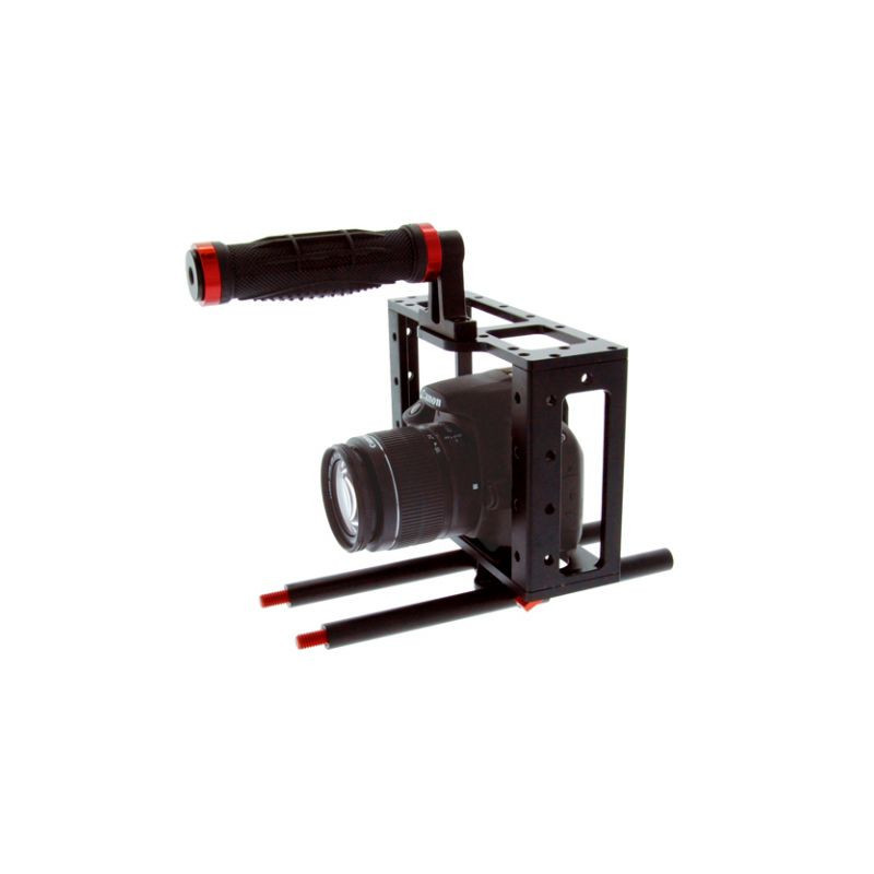 Le rig mobile CG-C2 (cage pour appareil photo) est spécialement conçu pour les Canon 5D, 7D et 60D mais convient également à d'autres appareils photo tant que les dimensions ne dépassent pas 15,5 cm de largeur et 12 cm de hauteur.